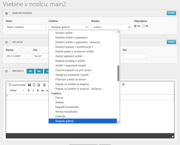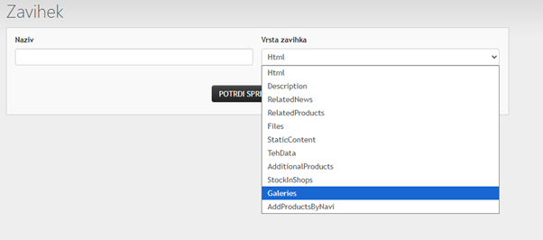 Dodatne galerije slik v opisu izdelka: Poleg glavne galerije lahko zdaj v opis izdelka (v poseben zavihek) dodate eno ali več dodatnih galerij. Idealno za prikaz tehničnih podrobnosti, navodil za uporabo ali slik iz različnih kotov.