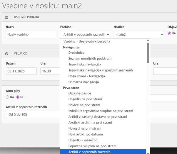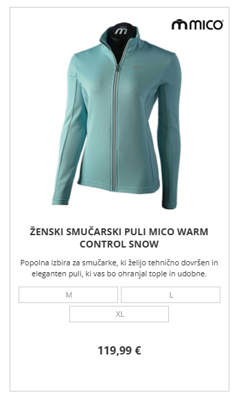 Primer: Če obiskovalec v košarico doda izdelek iz kategorije "Smuči", mu lahko avtomatsko ponudite 10% popust na vse izdelke iz kategorije "Smučarske palice".