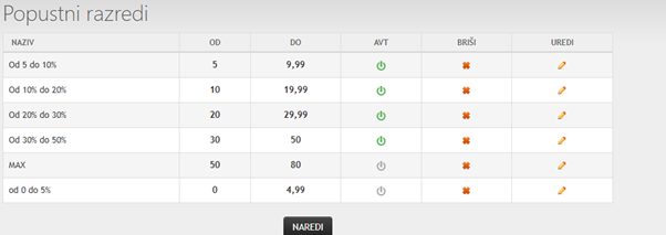 Primer: Če ima izdelek 13% popust, bo samodejno uvrščen v filter "10-20%", kar kupcem omogoča ciljano iskanje glede na višino popusta. Odpreti morate popustne razrede ter filter popusti in vsakemu popustnemu razredu določite pripadajoč filter.