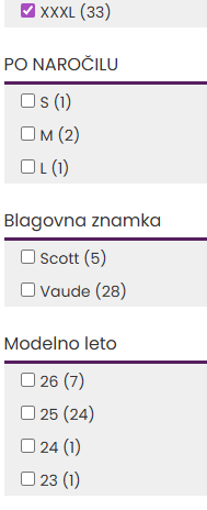 Prikaz števila izdelkov v filtrih: Za boljšo preglednost bodo obiskovalci zdaj ob vsaki vrednosti filtra (npr. "Modra", "Velikost L") takoj videli, koliko izdelkov ustreza tej izbiri.