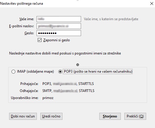 V kolikor je vse v redu nastavljeno bo thunderbird sam našel nastavitve emaila. Samo izberete Pop3.